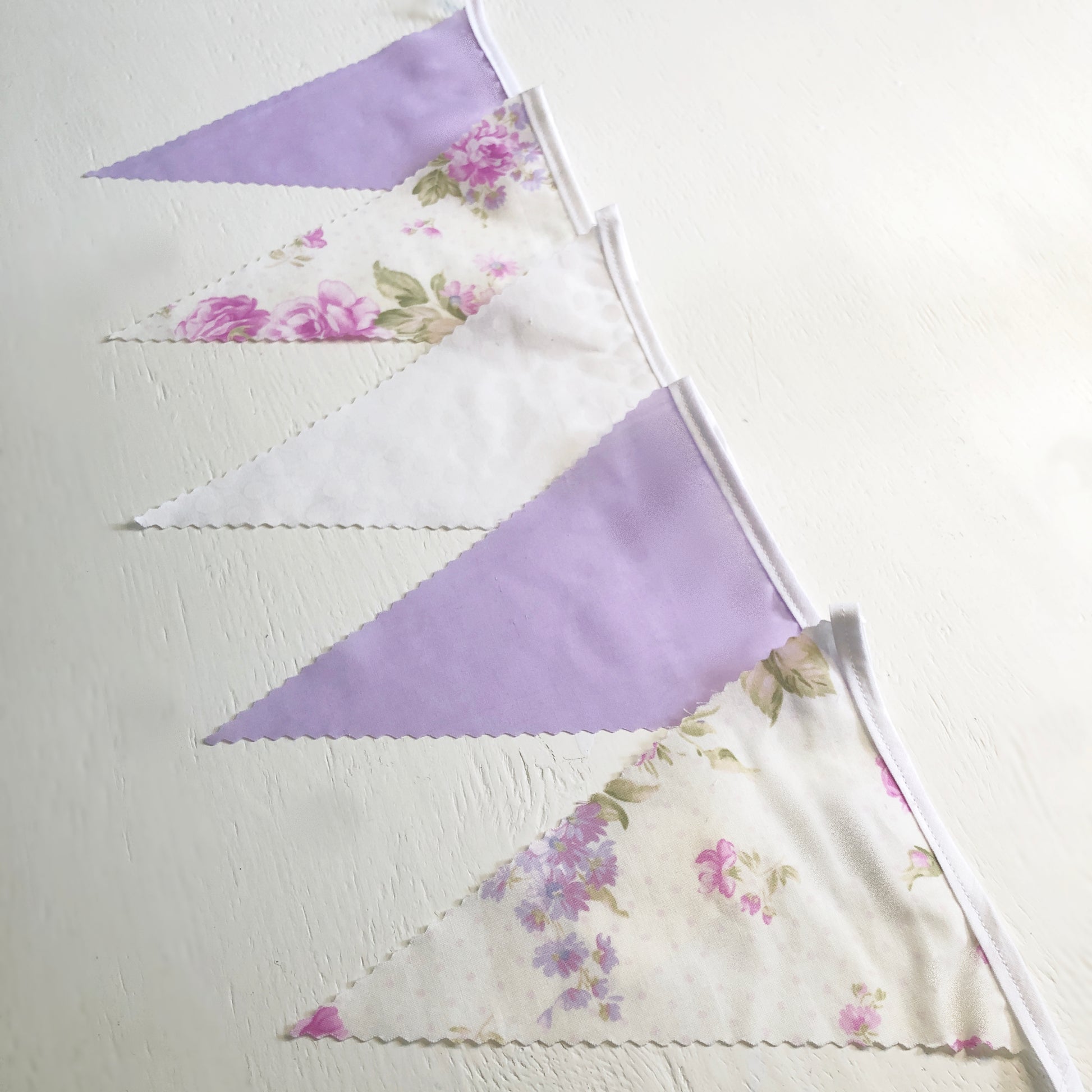 Lilac rose & white spot mix bunting with white trim.
